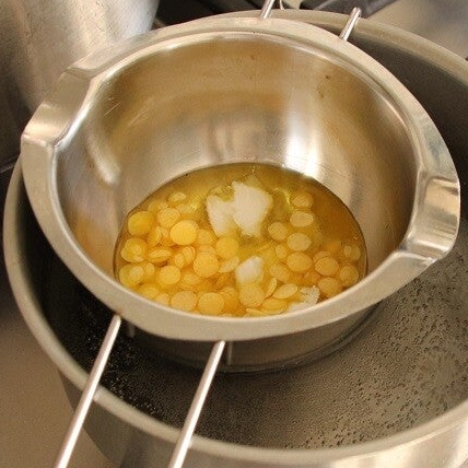 Vul een grote pan met kokend water. Doe de bijenwas, shea butter en kokosolie in een kleinere pan en hang deze pan in de pan met kokend water. Roer tot de ingrediënten gesmolten zijn en haal het pannetje van het water. Voeg 1 druppel essentiële olie naar keuze toe.